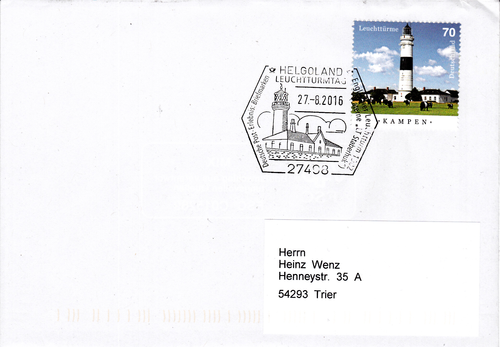 Die bereits auf der ersten Seite in diesem Thema gezeigte Marke mit dem Leuchtturm "Roter Sand" ist hier mit dem Ersttagsonderstempel aus Berlin gestempelt worden.