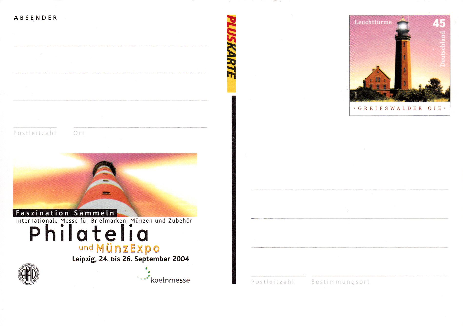 Zur "Philatelia Leipzig" ist 2004 auch eine Sonderpostkarte (MiNr PSo 87) erschienen, die einen Wertzeicheneindruck mit dem Bild des hier bereits vorgestellten Leuchtturm Greifswalder Oie (Bild der Marke MiNr 2409) hat. Hier eine unbenutzte Karte.