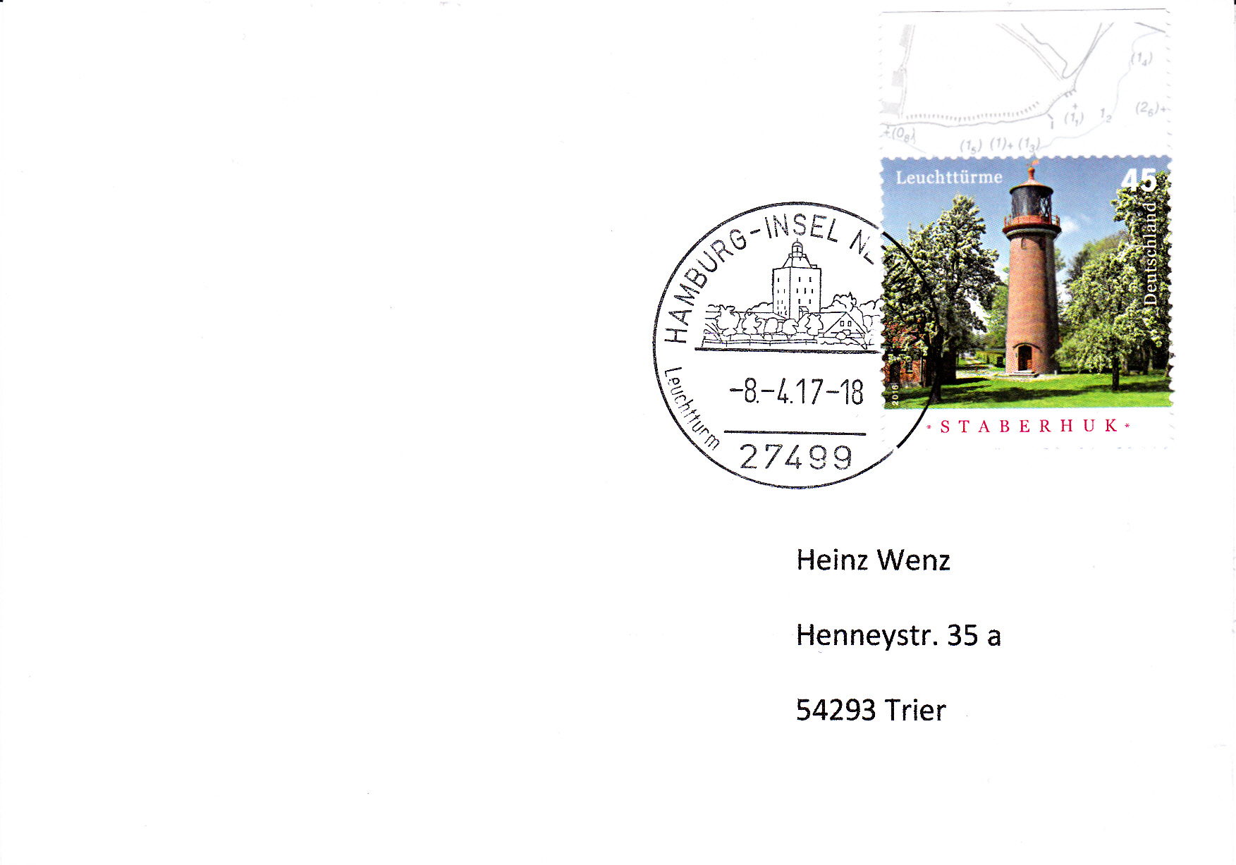 Für die EB-Teams der Deutschen Post AG wurden Umschläge mit dem vorhergezeigten Tagesstempel 24499 Hamburg-Insel Neuwerk hergestellt und verkauft. Hier ein solcher Umschlag:
