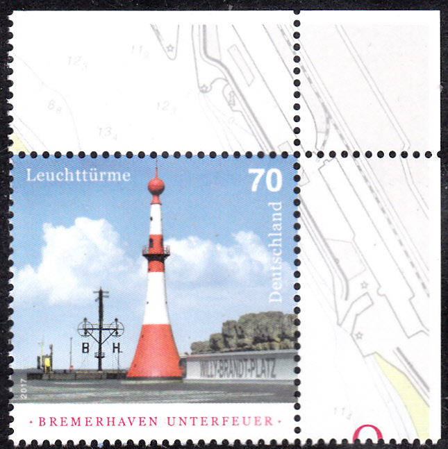 In der Serie "Leuchttürme" der Deutschen Post AG ist ebenfalls am 8.6.2017 eine Marke zu 70 Cent (MiNr 3317) mit der Abbildung des Leuchtturms Bremerhaven Unterfeuer erschienen. Hier ein Eckrandstück: