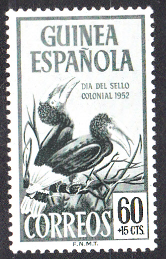 Zum Tag der Briefmarke 1952 erschien in den Spanische Besitzungen im Golf von Guinea eine Serie mit drei Marken mit der Abbildung zweier Weißschnabel-Hornvögel (Bycanistes cylindricus albutibialis).