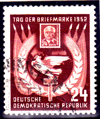 Einzelfrankatur der Marke zum Tag der Briefmarke 1952 auf einem Brief von Anklam nach Freiberg/Sachsen. Der Brief wurde mit einem Sonderstempel zur Lilienthal-Woche gestempelt.
