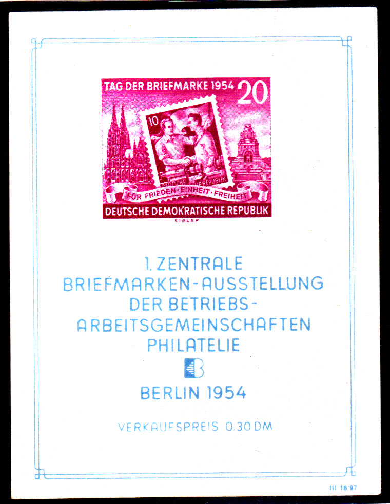 Am 30.10.1954 erschien ein Block zur 1. Zentralen Briefmarkenausstellung der Betriebsarbeitsgemeinschaften (MiNr Block 10) mit der Marke zum Tag der Briefmarke 1954.