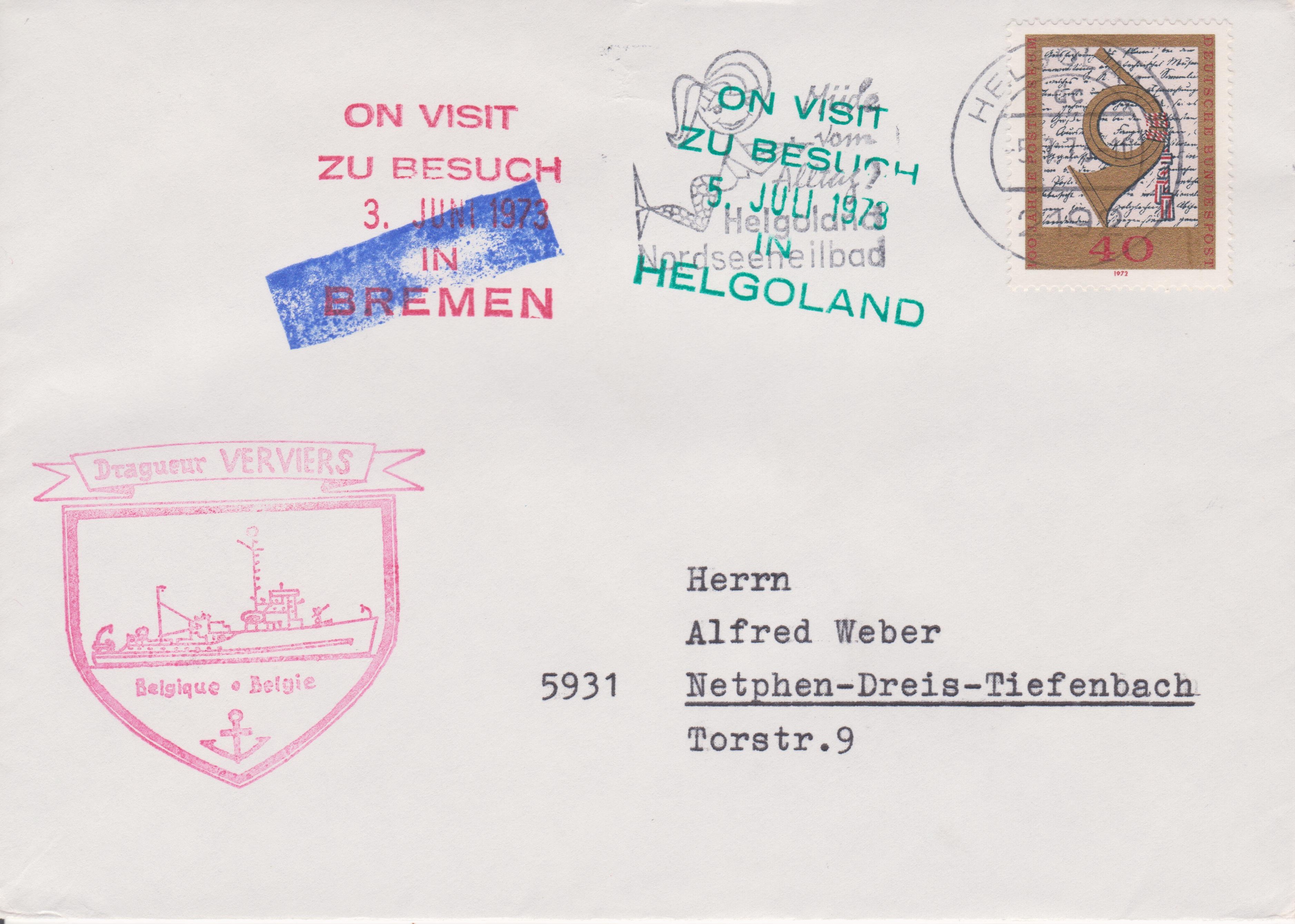 M934 VERVIERS war in der US Navy zuvor MSC-259. Dieses Minensuchboot besuchte am 05.07.1973 HELGOLAND, was dieser Beleg dokumentiert: