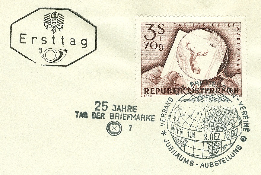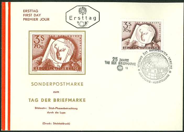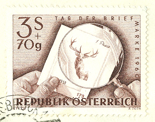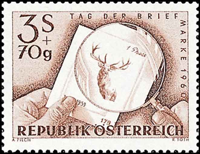 Das Markenmotiv zeigt einen Probeabzug der Originalplatte der Wertstufe zu S 3,70 der Jagdserie 1959 während der Sticharbeit, durch eine Lupe betrachtet. Der Probeabzug zeigt dem Stecher, wie weit die gewünschten Tonabstufungen in der Originalplatte bereits erreicht sind. Die Wichtigkeit des Kontrolldruckes ergibt sich aus der Tatsache, daß der Stecher nur eine Verstärkung der Linien und Punkte vornehmen kann. Ein Abschwächen der Linien würde auf Kosten der Drucksicherheit und damit der Sauberkeit des Stiches gehen. Bei Betrachtung eines Druckes mit einer Lupe, wie es die Darstellung der vorliegenden Briefmarke zeigt, ist die Linienführung dem Betrachter leicht erkennbar. Es ist der Erfahrung und Überlegung des Stechers überlassen, die Abstände der Linien und Punkte von Anfang an so vorzunehmen, daß nach Beendigung des Stiches die erreichten Tonabstufungen in der Kleinheit des Markenbildes dem Original des Entwerfers entsprechen.