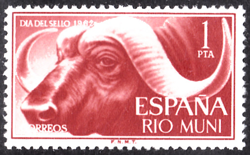 Für Rio Muni (von 1959 bis 1963 spanische Provinz, heute Äquatorial-Guinea) wurden am 21.11.1962 drei Werte zum Tag der Briefmarke verausgabt. Hier zeige ich die Marke zu 15 Cts (MiNr 32) mit der Abbildung eines Kaffernbüffels (Syncerus caffer).