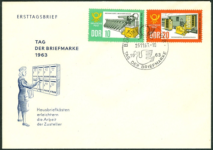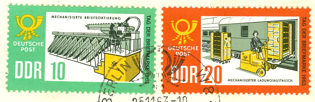 1963 gab die DDR-Postverwaltung am 25. November 1963 zwei Postwertzeichen heraus. Der 10 Pfennig-Wert (MiNr. 998, mehrfarbig) zeigt eine Briefverteilmaschine und der 20 Pfennig-Wert (MiNr. 999, mehrfarbig) einen Bahnpostwagen.