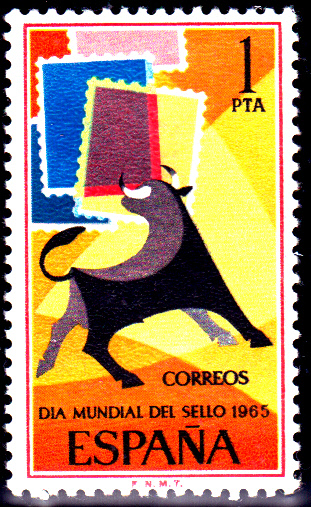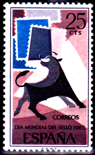 In Spanien erschien am 6.5.1965 zum Welttag der Briefmarke eine dreiwertige Serie mit dem Motiv "Stier vor Briefmarken".