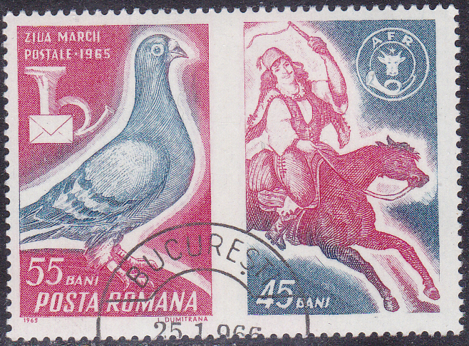 Zum Tag der Briefmarke 1965 erschien in Rumänien am 15.11.1965 diese Marke (MiNr 2457) mit einer Brieftaube, einem Posthorn und einem Brief. Diese Marke wurde mit einem waagerecht anhängendem Zierfeld gedruckt, das einen Zuschlag von 45 Bani aufweist.