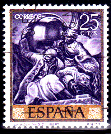 Im Jahre 1966 erschien in Spanien zum Tag der Briefmarke eine Serie von zehn Briefmarken mit Gemälden von José María Sert. Aus dieser Serie zeige ich hier die Marke zu 25 Cts (MiNr 1599) mit dem Gemälde "Die magische Kugel".