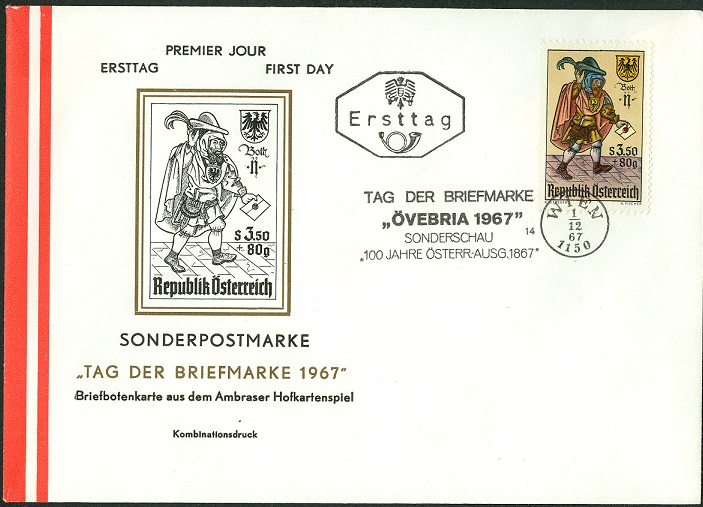 Auf diesem Brief mit Eilboten von Wien nach Osnabrück wurden drei Marken zum Tag der Briefmarke (MiNr 1255) mit dem Ersttagstempel Wien mit der Kennziffer "10" entwertet. Rückseitig sind ein Ankunftsstempel Osnabrück und Durchgangsstempel angebracht worden.