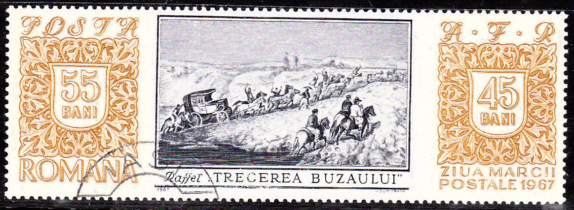 In Rumänien erschien am 15.11.1967 eine Zuschlagsmarke (55 + 45 Bani) zum Tag der Briefmarke 1967 (MiNr 2634). Die Marke zeigt "Die Überquerung des Flusses Buzău nach einer Lithographie von Auguste Raffet (1804-1860) (französischer Maler und Graphiker).