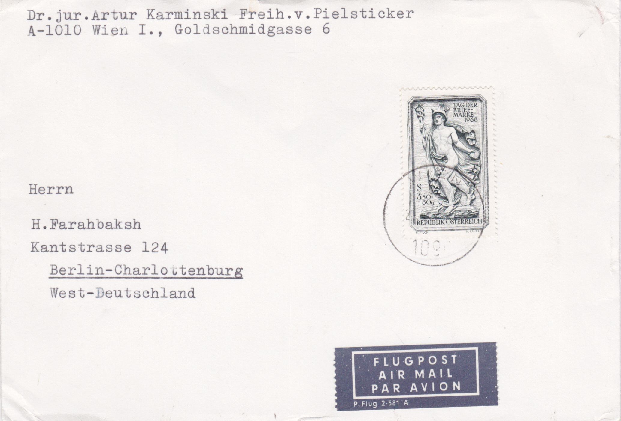 Brief von Wien nach Berlin-Charlottenburg mit der Marke zu Tag der Briefmarke 19687 aus Österreich.