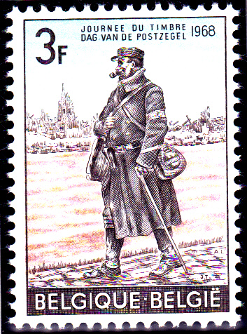 Die Marke zum Tag der Briefmarke 1968 aus Belgien (MiNr 1502) zeigt uns einen Feldpostbriefträger aus dem Jahre 1916. Ausgabetag war der 17.3.1968.