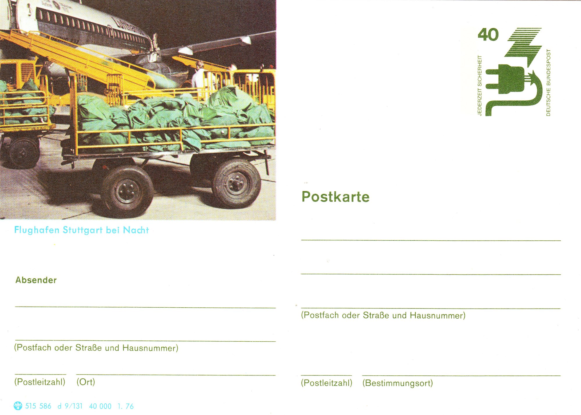 Diese Ganzsache aus dem Jahre 1976 zeigt uns als Motiv einen Transportwagen bei Nacht auf dem Flughafen Stuttgart: