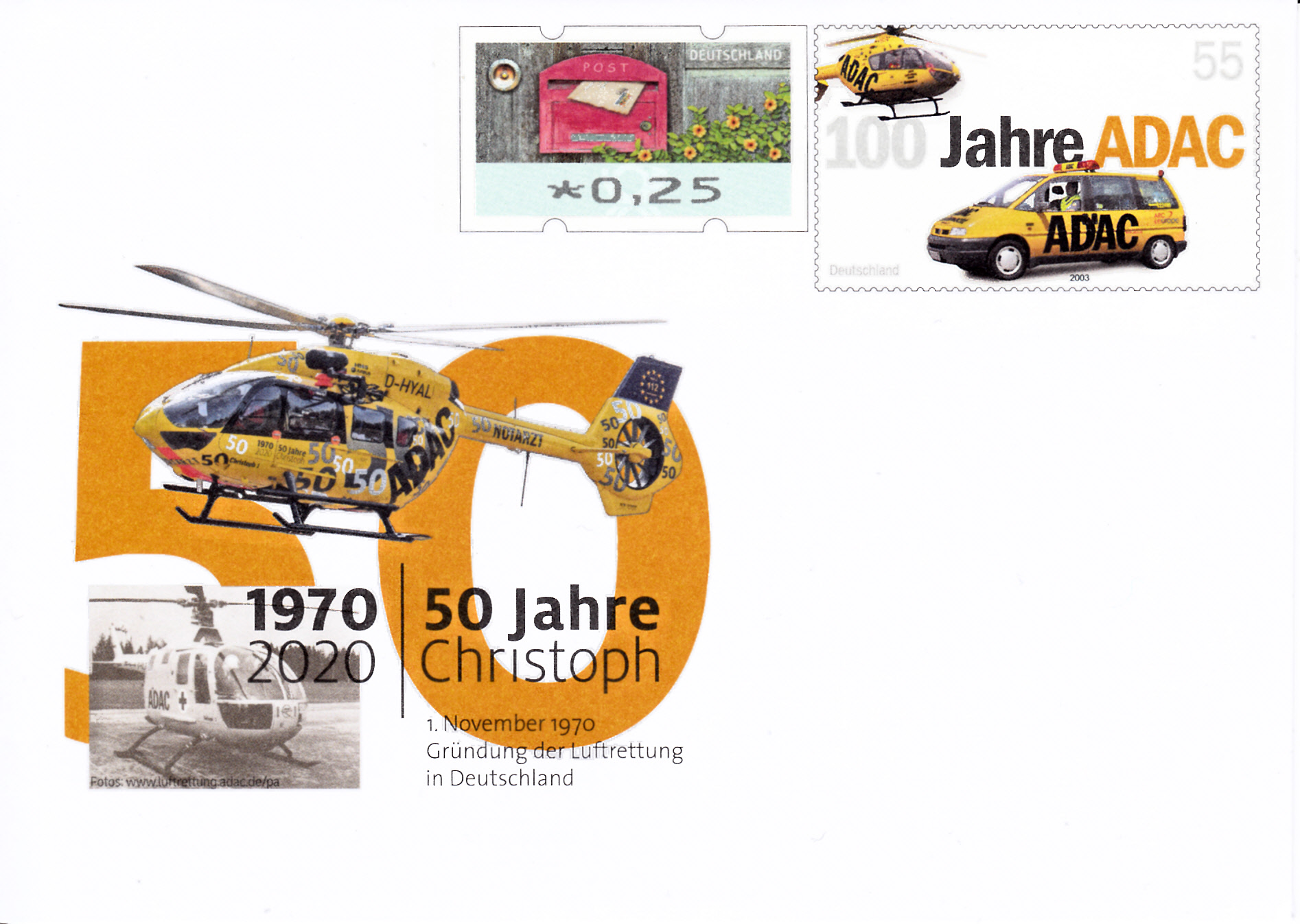 Diese Gedenkganzsache "50 Jahre Christoph" hat einen Wertstempel im Muster der Marke "100 Jahre ADAC und einer Automatenmarke zu 25 Cent.