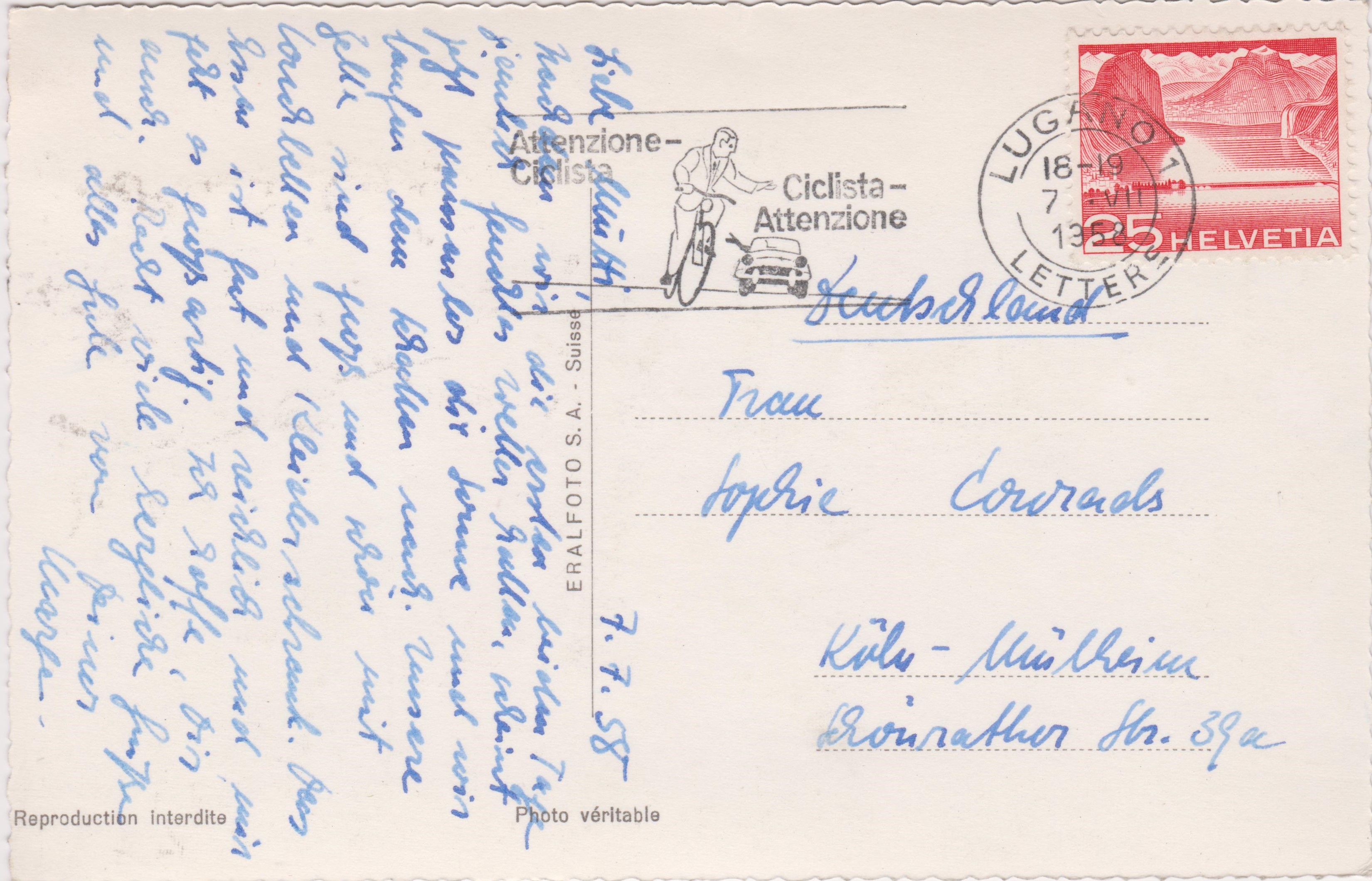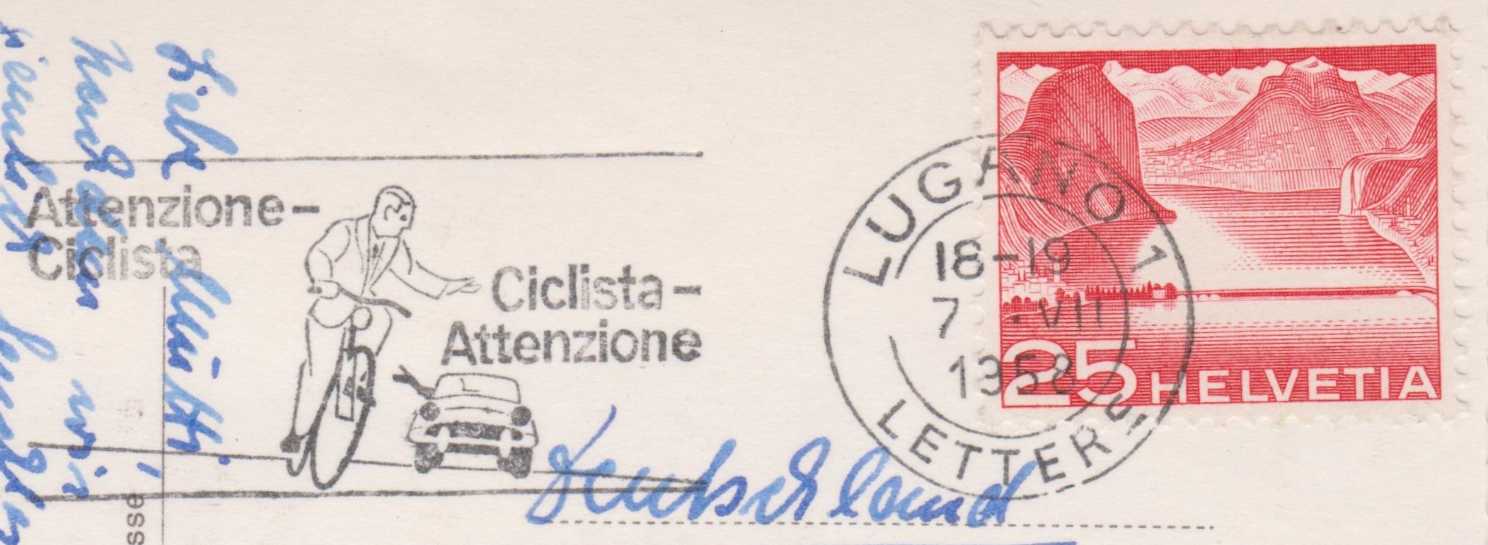 Werbeeinsatz "Attenzione-Ciclista Ciclista-Attenzione" (= Achtung-Radfahrer Radfahrer-Achtung) am 07.07.1958 in einem Maschinenstempel aus LUGANO: