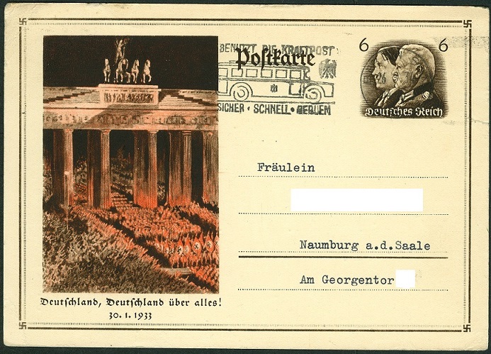 Maschinenstempel vom 13.05.1936 aus Leipzig mit Werbeeinsatz "Benutzt die Kraftpost" mit Darstellung eines zeitgenössischen Omnibusses der Kraftpost: