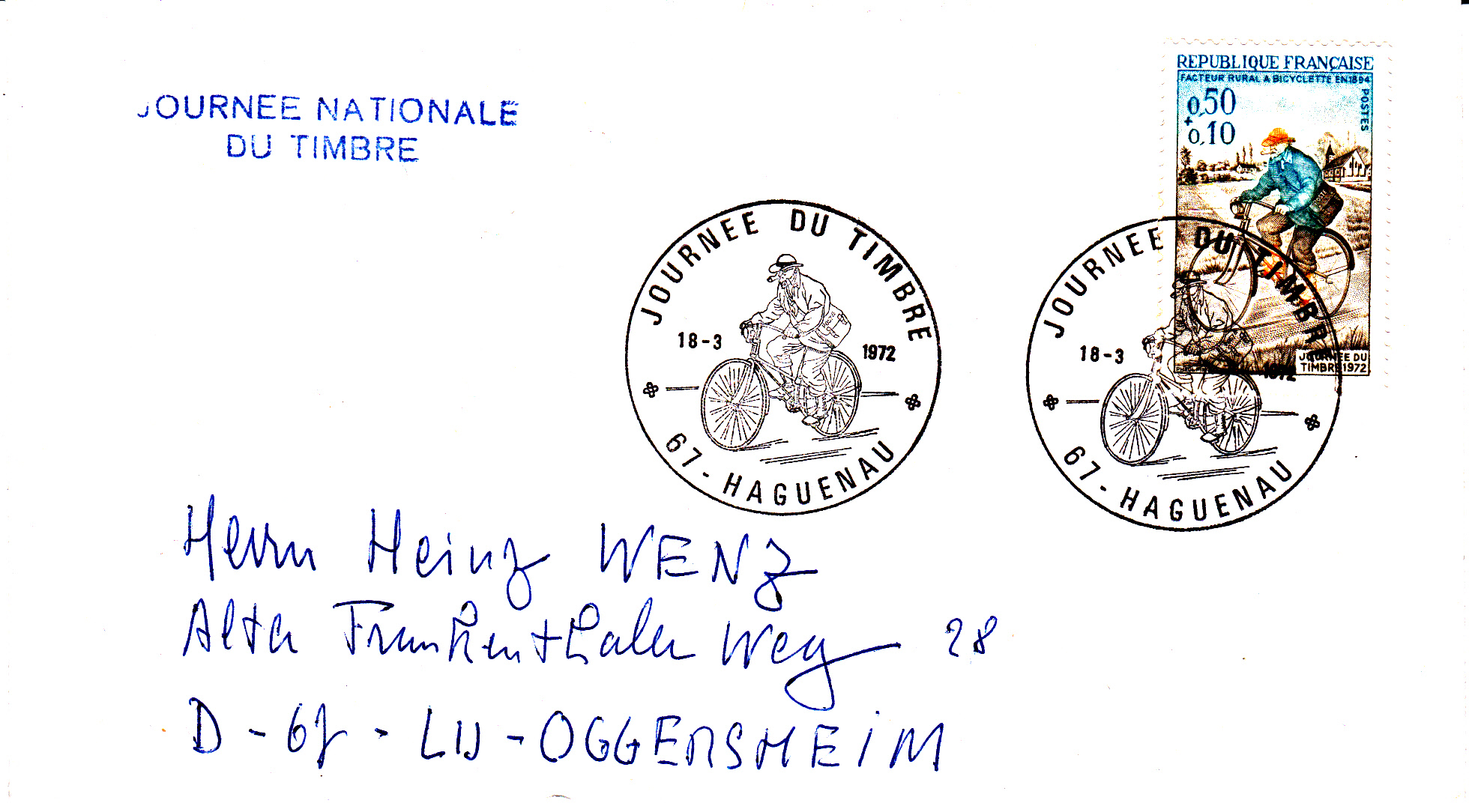 Die Marke zum Tag der Briefmarke 1972 in Frankreich (MiNr 1784) mit der Abbildung eines Landbriefträgers von 1894 ist am 18.3.1972 erschienen. Hier ein Brief vom Ersttag mit einem motivgleichen Sonderstempel aus Haguenau.