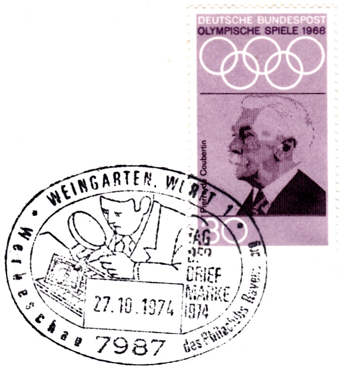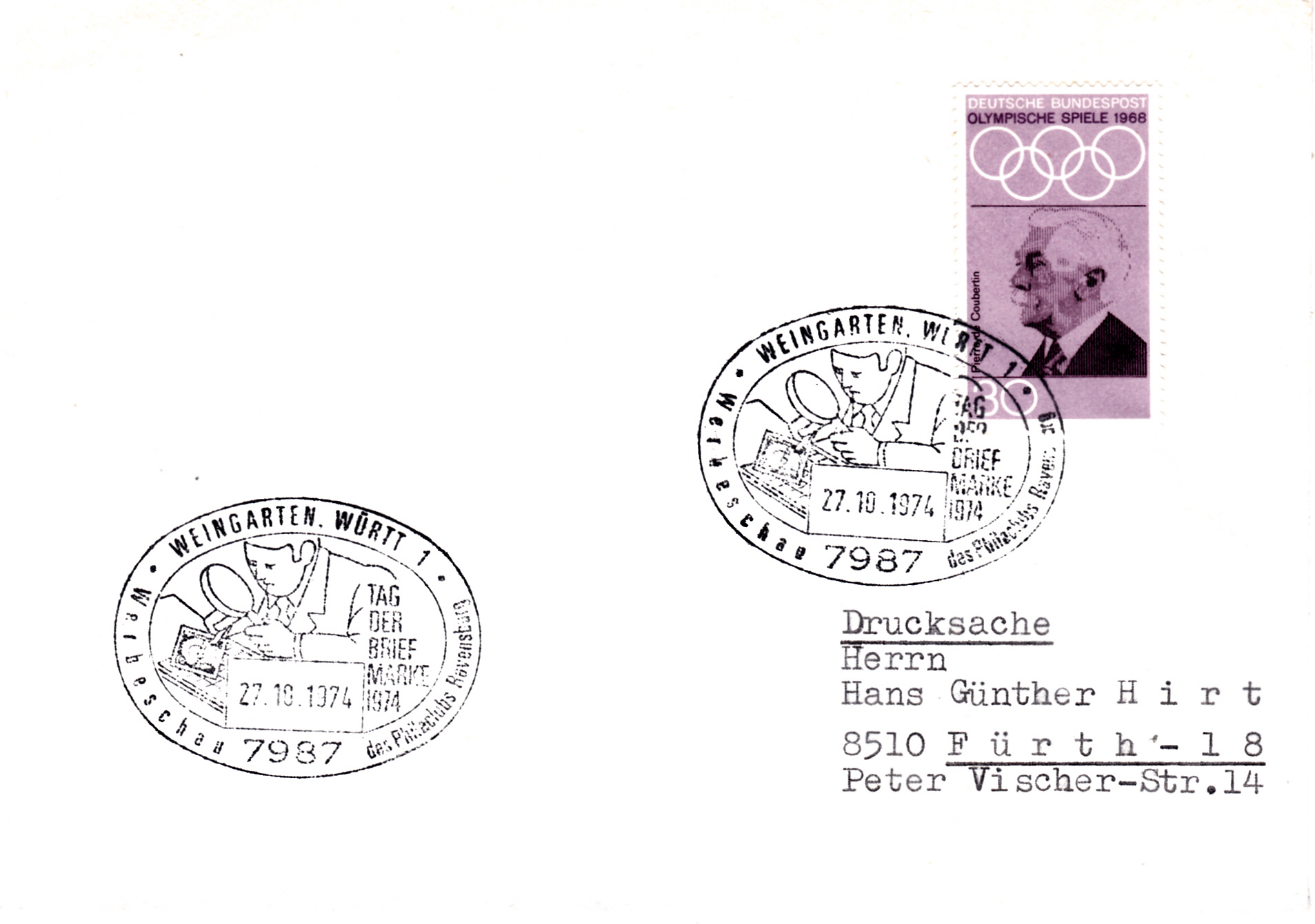 Sonderstempel vom 27.10.1974 aus Weingarten, Württemberg zum Tag der Briefmarke 1974.