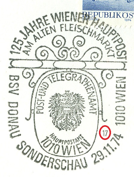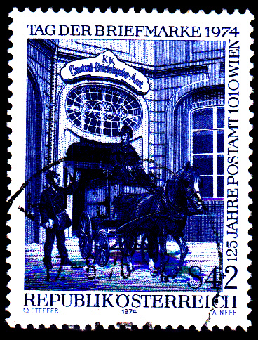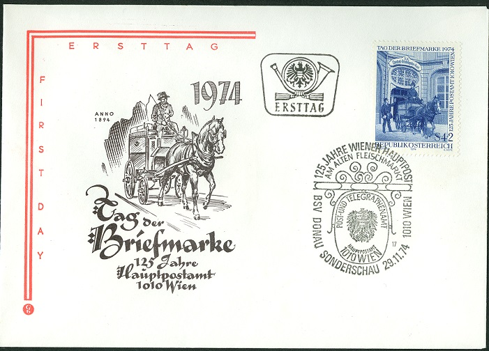 Am 29.11.1974 erschien in Österreich eine Zuschlagsmarke zum Tag der Briefmarke 1974 (MiNr 1471) mit dem Motiv "Posthof des Post- und Telegraphenamtes 1010 Wien im Jahre 1905".
