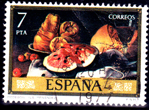 Am 29.9.1976 erschien in Spanien eine Serie mit acht Marken zum Tag der Briefmarke 1976 mit Stilleben von Luis Eugenio Menéndez. Aus dieser Serie kann ich hier den Wert zu 7 Ptas mit dem Motiv "Wassermelone, Brot, Weinglas" zeigen.