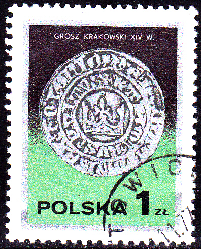 Zum Tag der Briefmarke 1977 ist in Polen eine Serie "Polnische Münzen" erschienen. Auf dieser Marke (MiNr 2525) wird die Vorderseite eines Silberdenar (11. Jh.) von Bolesław I. Chrobry (966-1025) gezeigt.