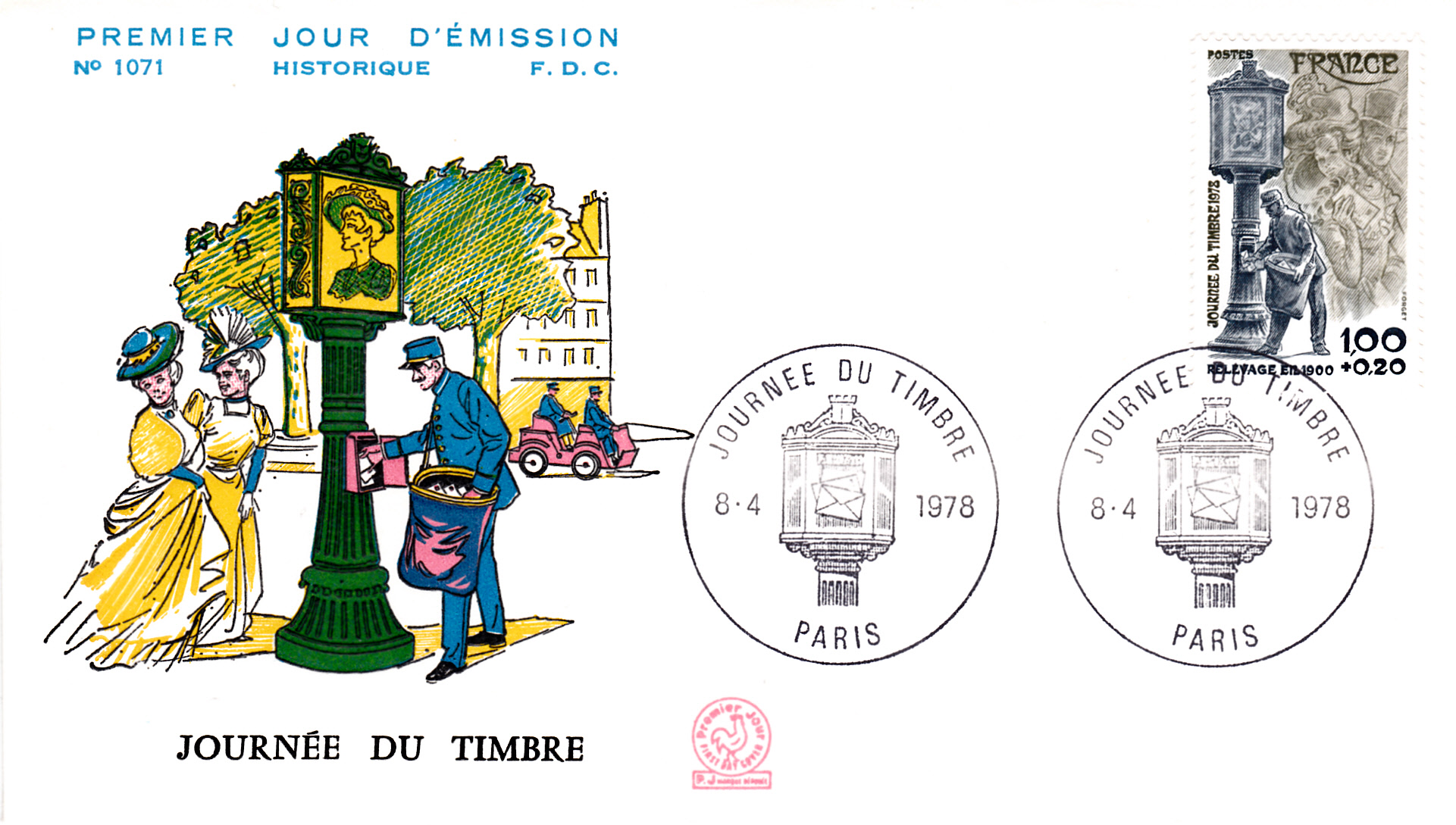 Diese Marke (MiNr 2092) mit der Abbildung einer Postkastenleerung um 1900 erschien am 8.4.1978 in Frankreich zum Tag der Briefmarke 1978.