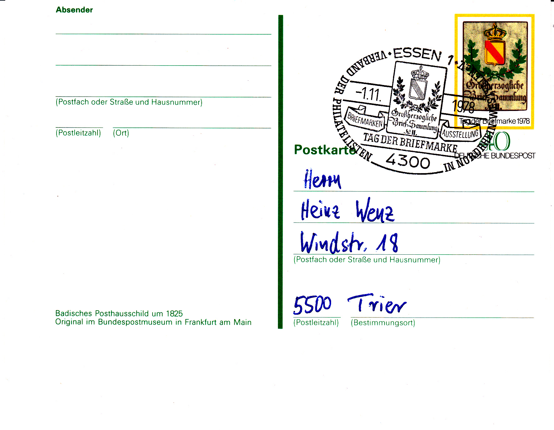 Am 01.11.1978 fand in Essen eine Briefmarkenausstellung zum "TAG DER BRIEFMARKE" statt. Dabei wurde dieser Sonderstempel eingesetzt, der als Motiv das Posthausschild aus dem Jahre 1844 aus Baden zeigt, das auch als Motiv für die am 12.10.1978 erschienene Sondermarke MiNr. 980 gedient hatte: