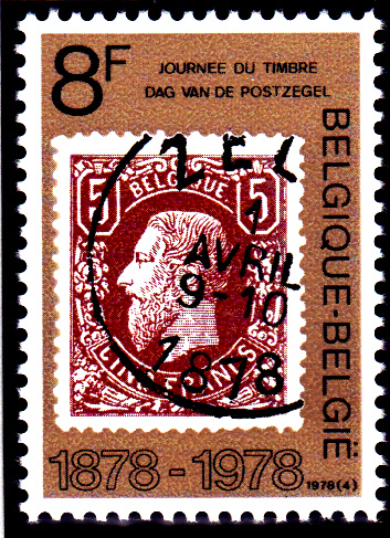 Diese Marke (MiNr 1942) mit der Abbildung einer gestempelte belgischen Marke MiNr. 34 erschien am 15.4.1978 in Belgien zum Tag der Briefmarke 1978.