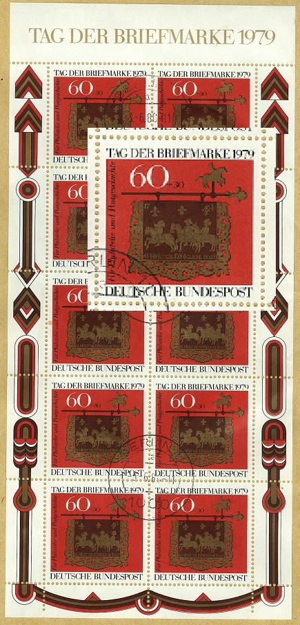 Hier ein gestempelter Zehnerbogen (auf Einschreibbrief aus Berlin/West). Die Einzelmarke etwas vergrößert.