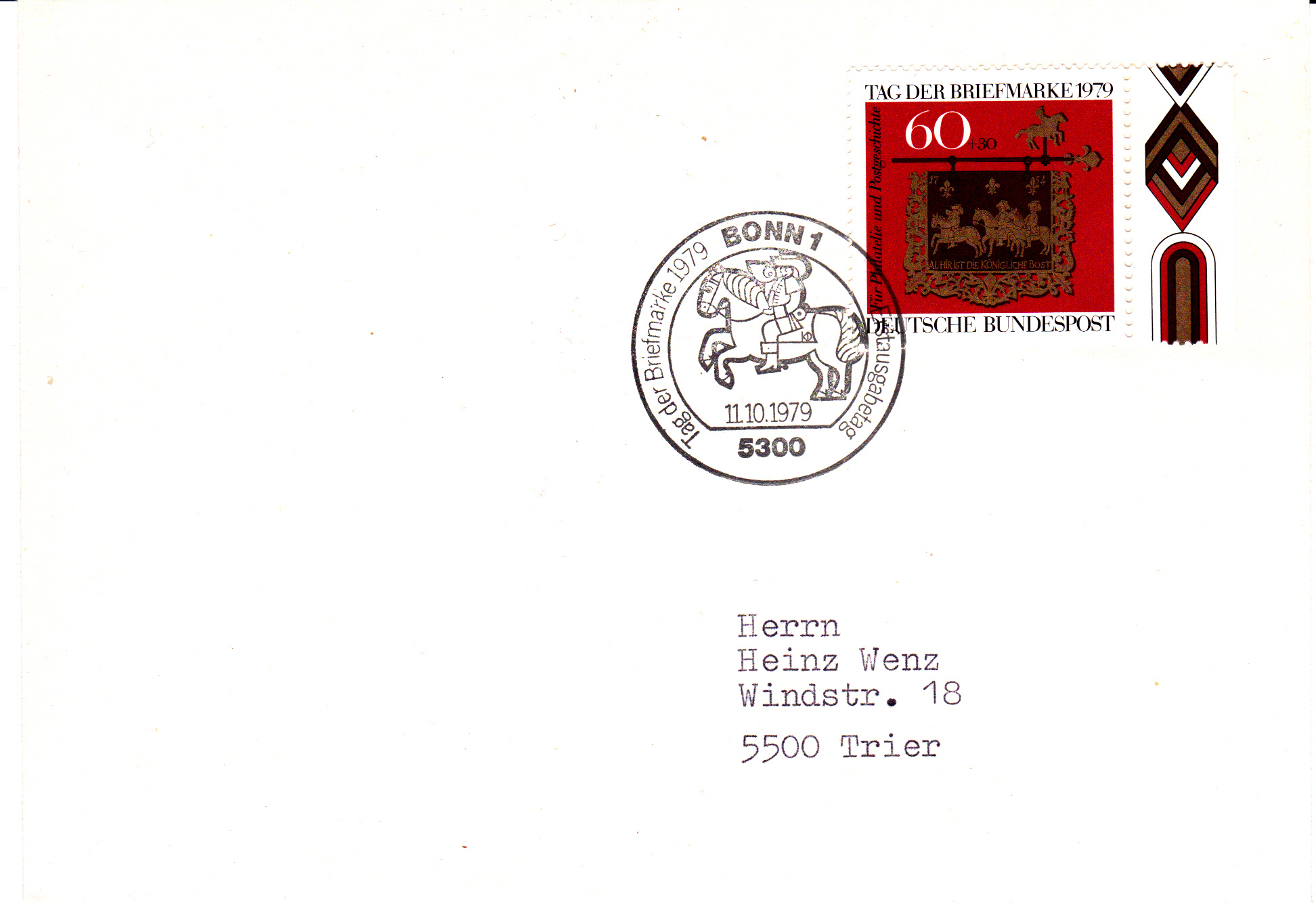 Die am 11.10.1979 erschienene Zuschlagsmarke zum Tag der Briefmarke 1979 hier auf einem Ersttagsbrief mit Ersttagssonderstempel Bonn.