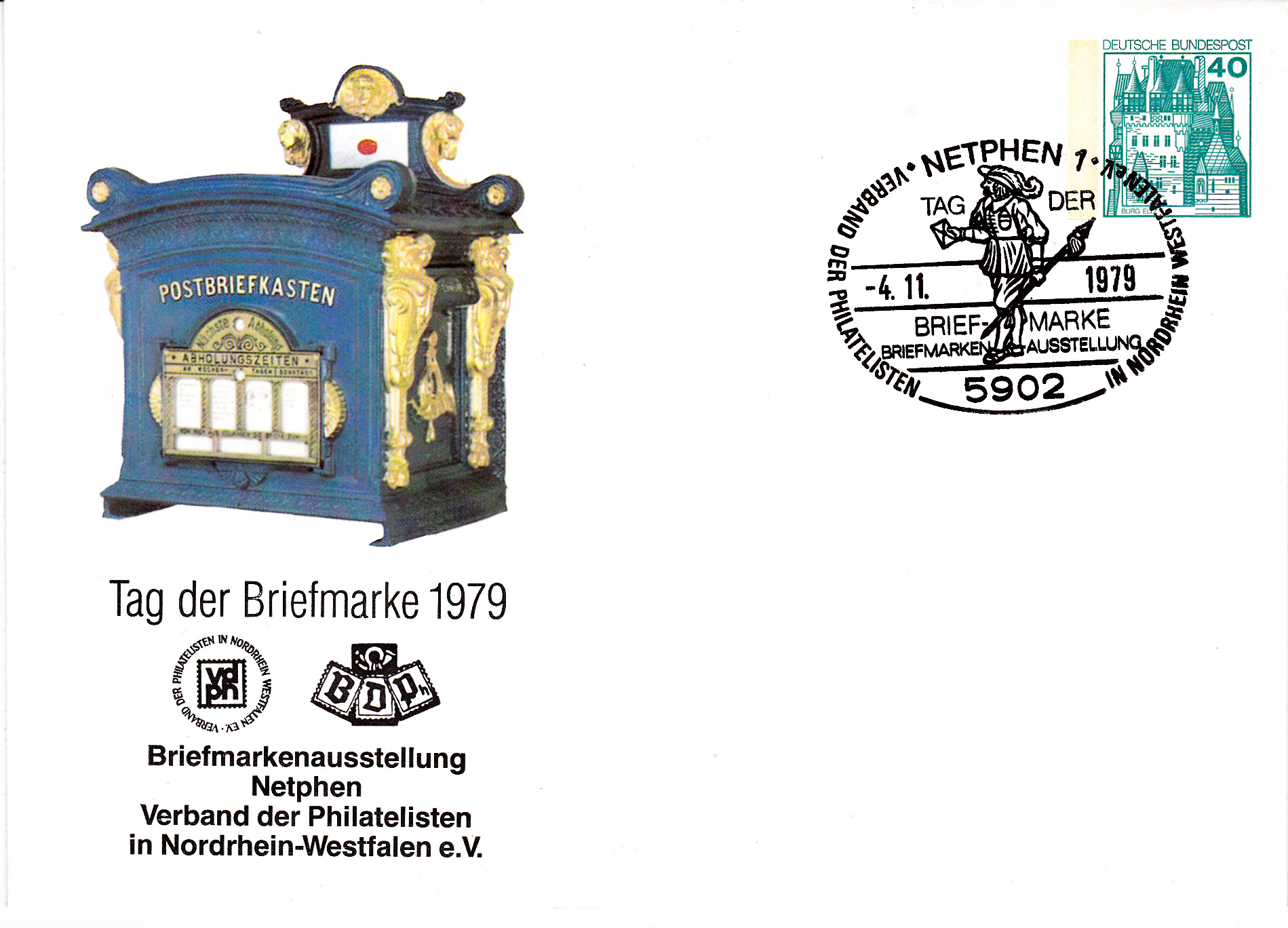 Ganzsachenumschlag zum Tag der Briefmarke 1979 mit dem Sonderstempel des LV Nordrhein-Westfalen e.V. zum TdB 1979 vom 4.11.1979 aus Netphen.