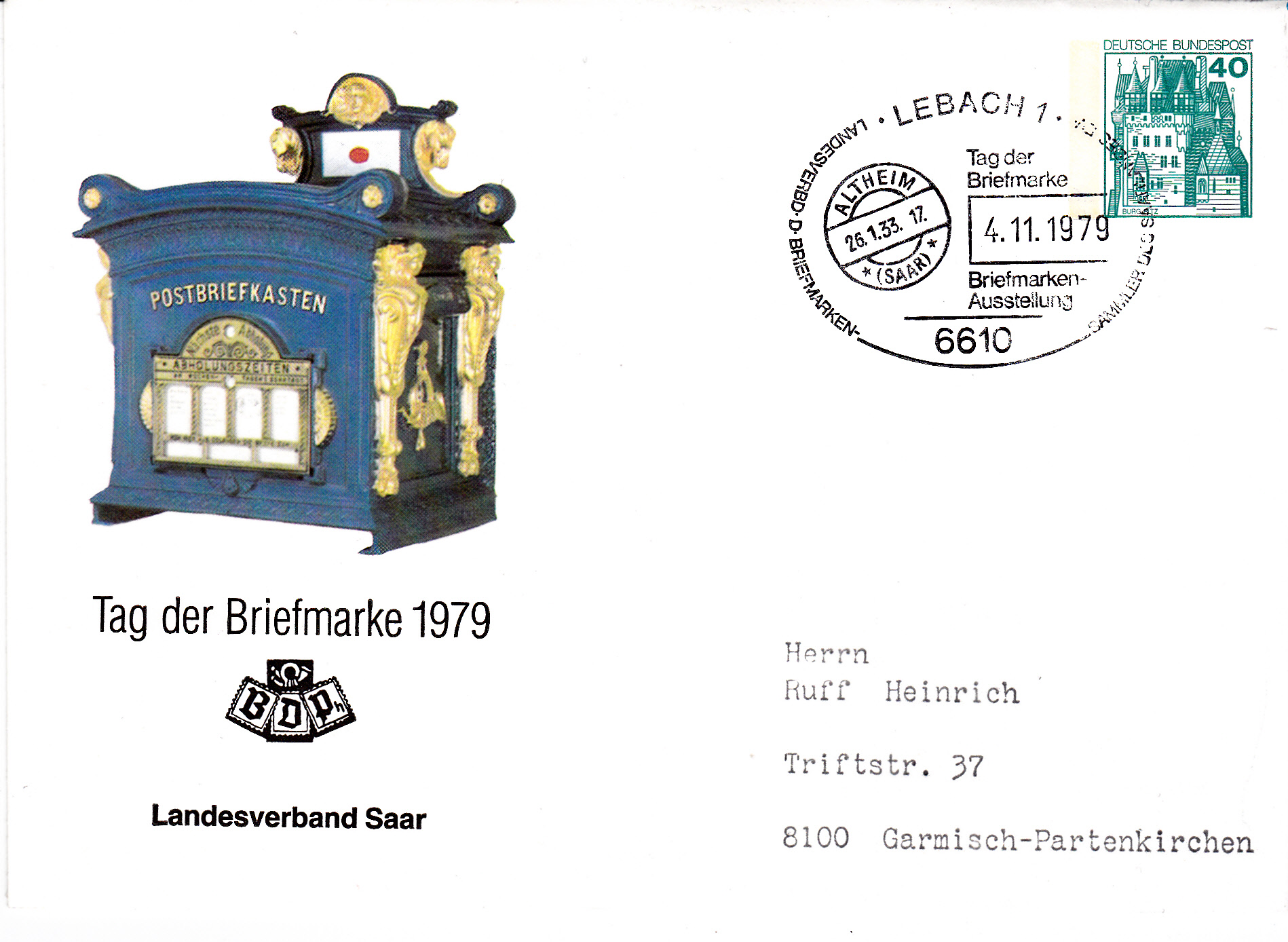 Hier ein gestempelter Zehnerbogen (auf Einschreibbrief aus Berlin/West). Die Einzelmarke etwas vergrößert.