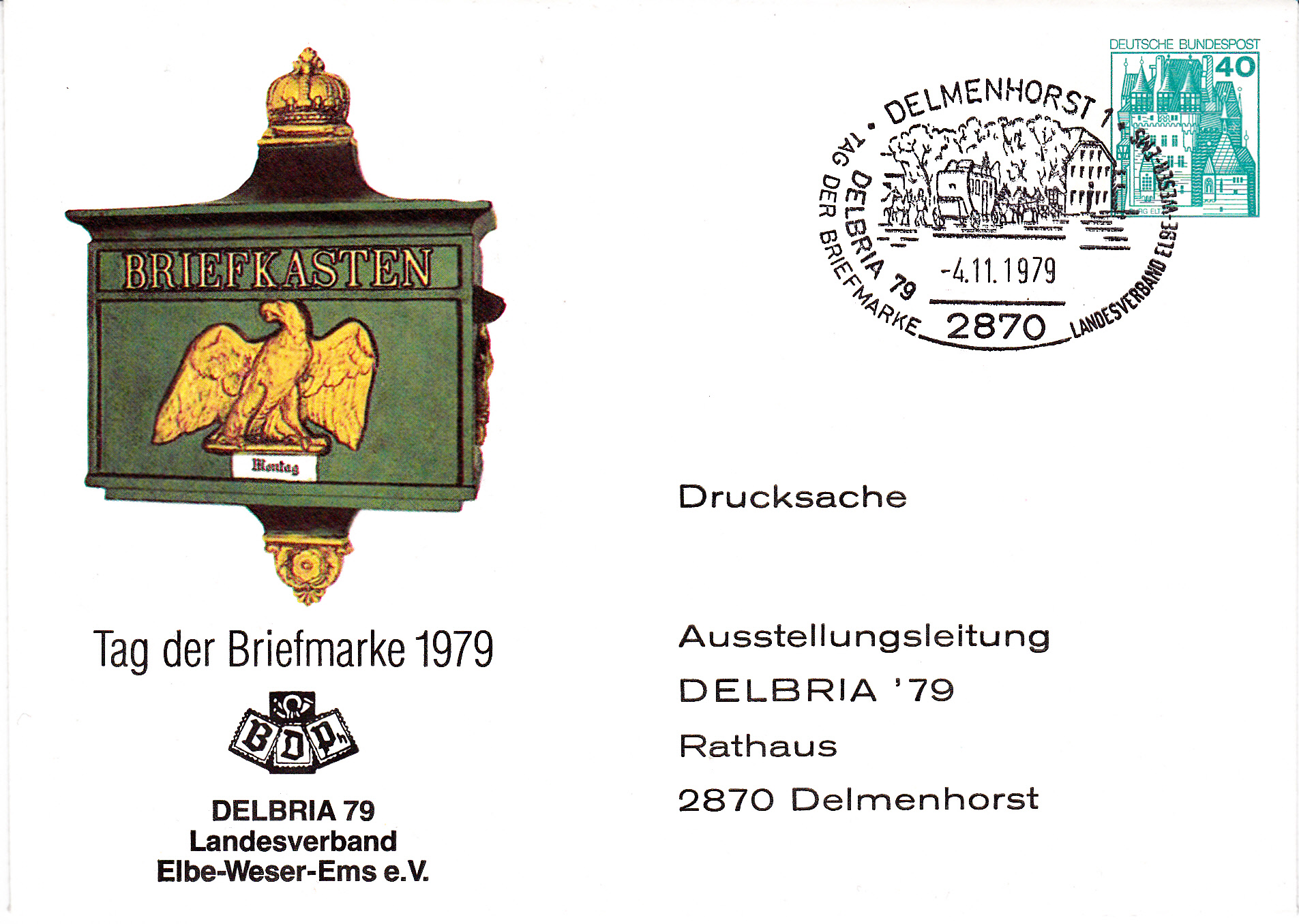 Ganzsachenumschlag zum Tag der Briefmarke 1979 mit dem Sonderstempel des LV Elbe-Weser-Ems e.V. zum TdB 1979 vom 4.11.1979 aus Delmenhorst.