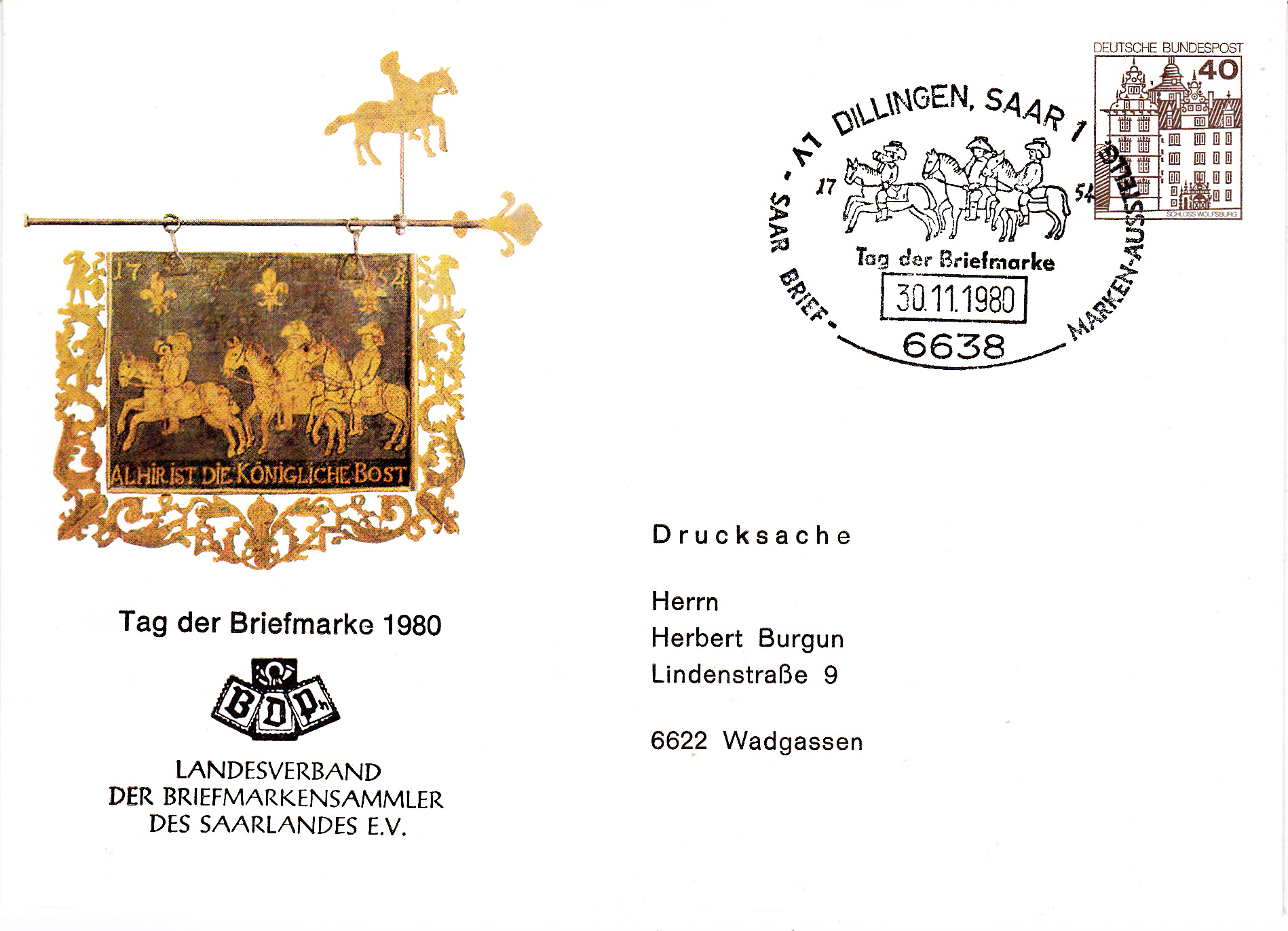 Ganzsachenumschlag zum Tag der Briefmarke 1980 des Landesverbandes der Briefmarkensammler des Saarlandes e,V, mit dem dazu gehörenden Sonderstempel aus Dillingen.