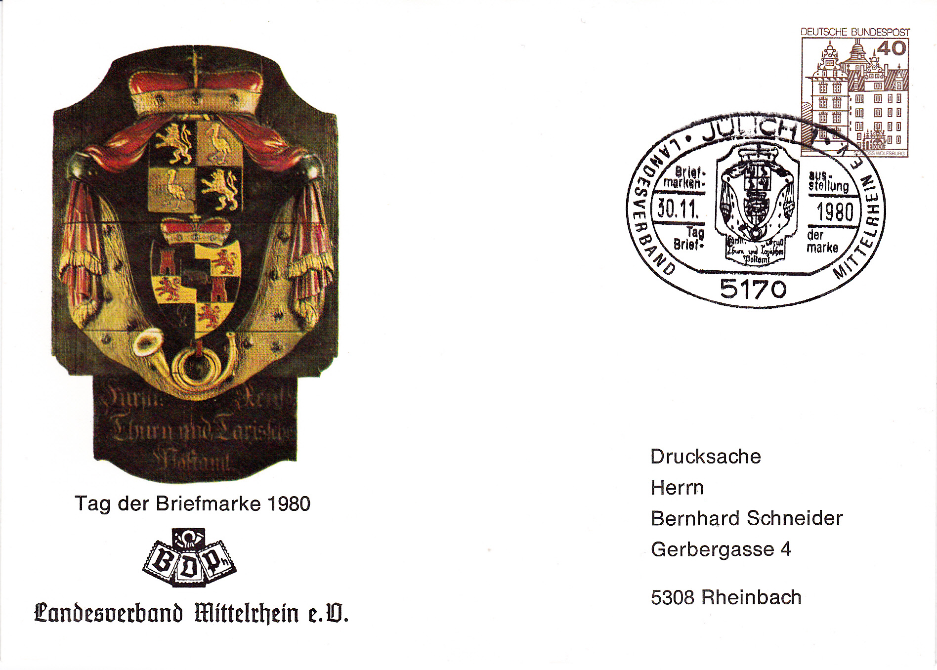 Ganzsachenumschlag zum Tag der Briefmarke 1980 des Landesverbandes Mittelrhein mit dem dazu gehörenden Sonderstempel aus Jülich vom 30.11.1980.