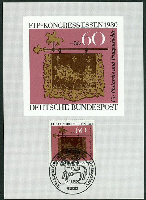 Wegen der MiNr. 1065, Anlass war der Kongress der Internationalen Philatelistenverbandes 1980 in Essen/Deutschland, gab es keine weitere Einzelausgabe zum Tag der Briefmarke in Deutschland, sondern die MiNr. 1065 wurde verklebt, um eine (Karton)Aktion Tag der Briefmarke zu starten.