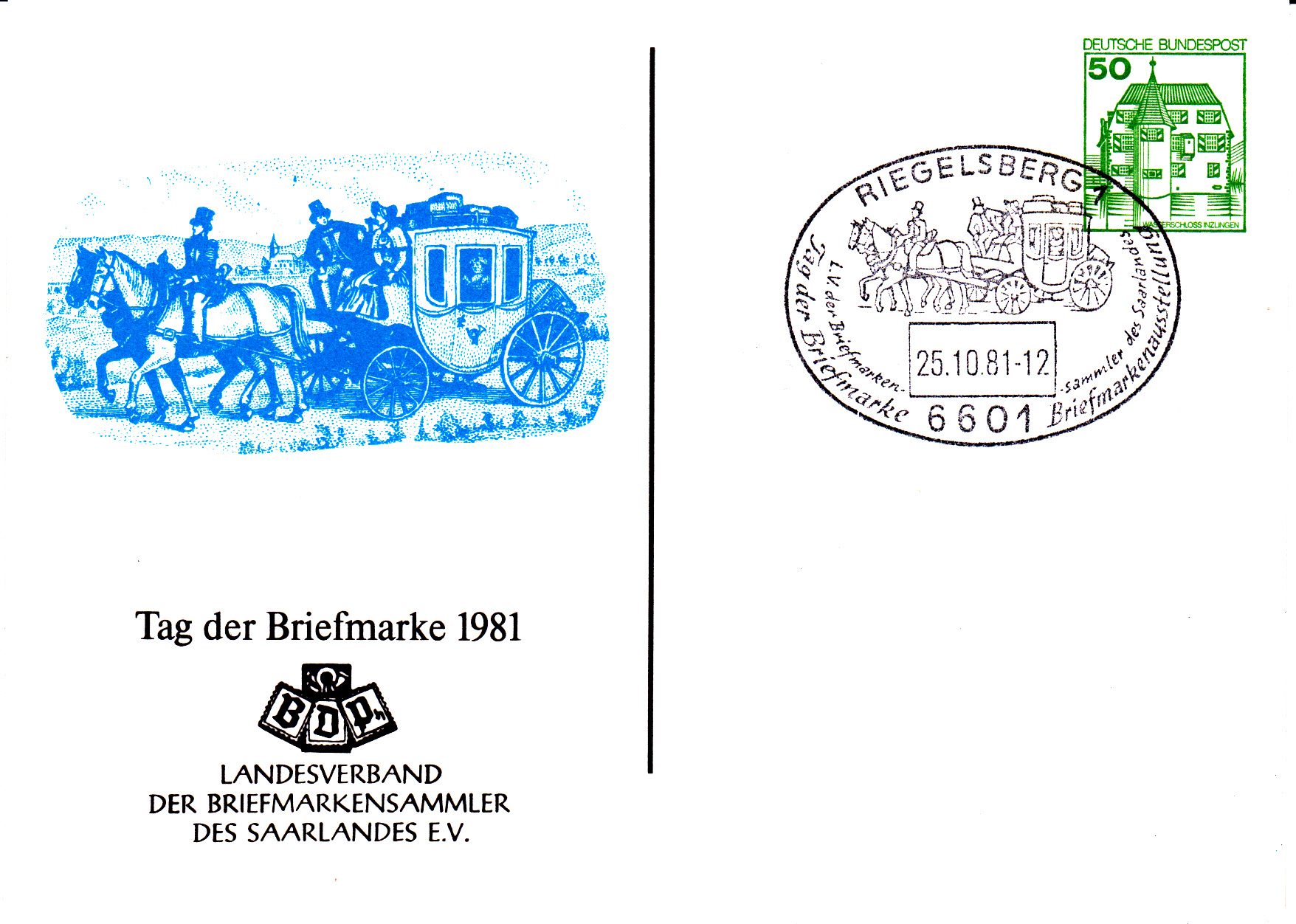 Hier nun noch die Ganzsachenpostkarte des Landesverbandes der Briefmarkensammler des Saarlandes e.V, der auf der Karte und im Stempel aus 6601 Riegelsberg die Postkutsche der Marke Saarland MiNr 291 (IBASA-Marke) zeigt.