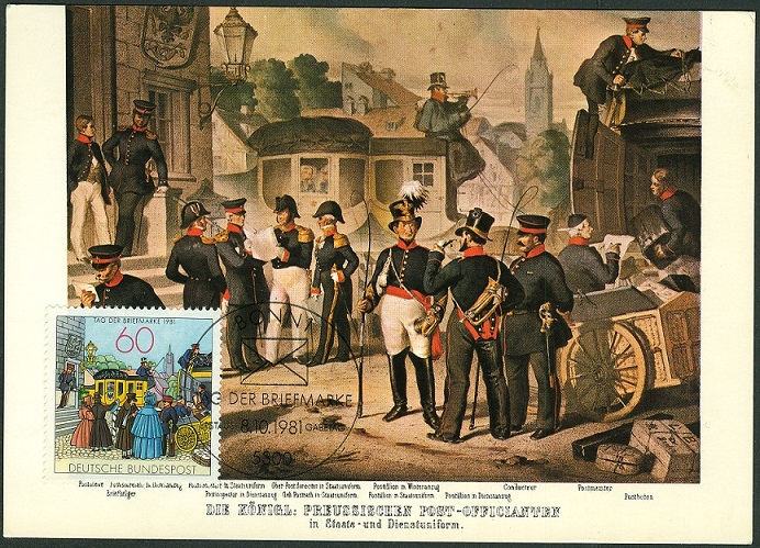 1981, zum Tag der Briefmarke, wurde die MiNr. 1112 den Sammlern vorgestellt. Hier ein Exemplar (von 31 825 000 Stück Gesamtauflage) auf einer Postkarte, auf der für die postgeschichtlich interessierten Preußensammler Postuniformen aus der Zeit um 1855 dargestellt werden. Ob es nur ein Bildausschnitt der Lithographie von Ludwig Burger ist?
