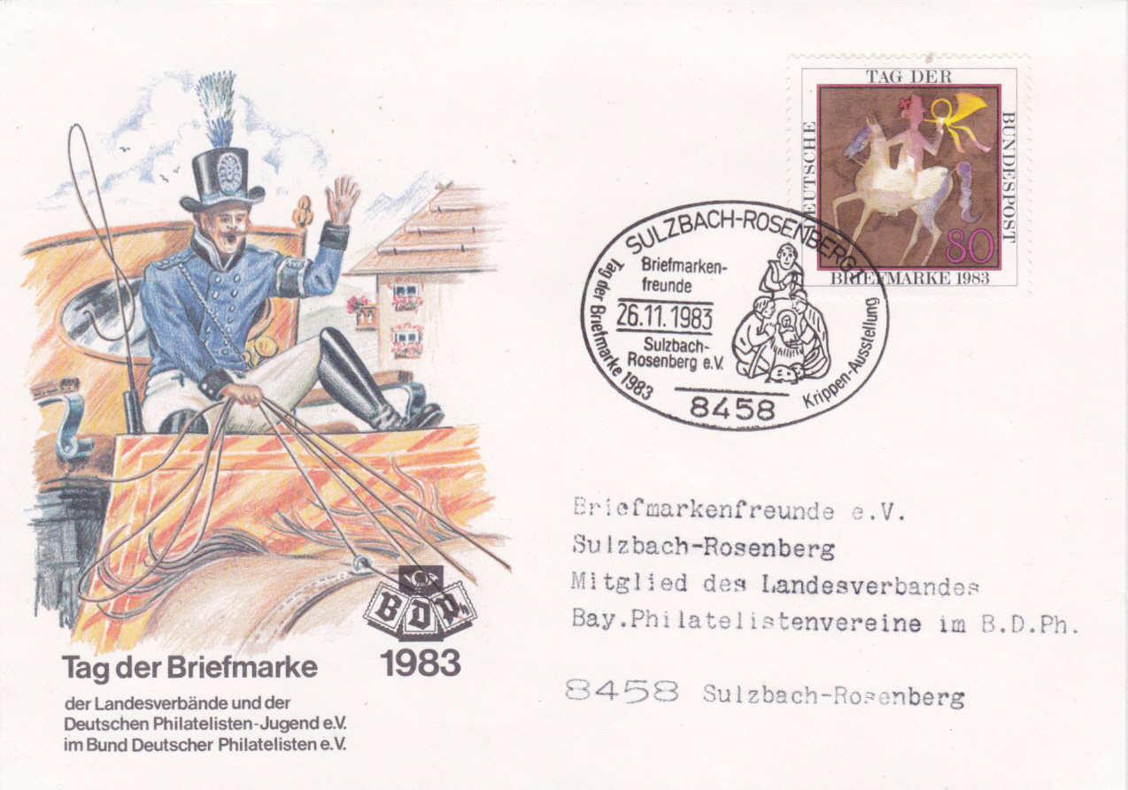 Dieser Umschlag zum Tag der Briefmarke wurde auch mit dem hier schon vorgestellten Sonderstempel zum Tag der Briefmarke aus Sulzbach-Rosenberg am 26.11.1983 gestempelt.