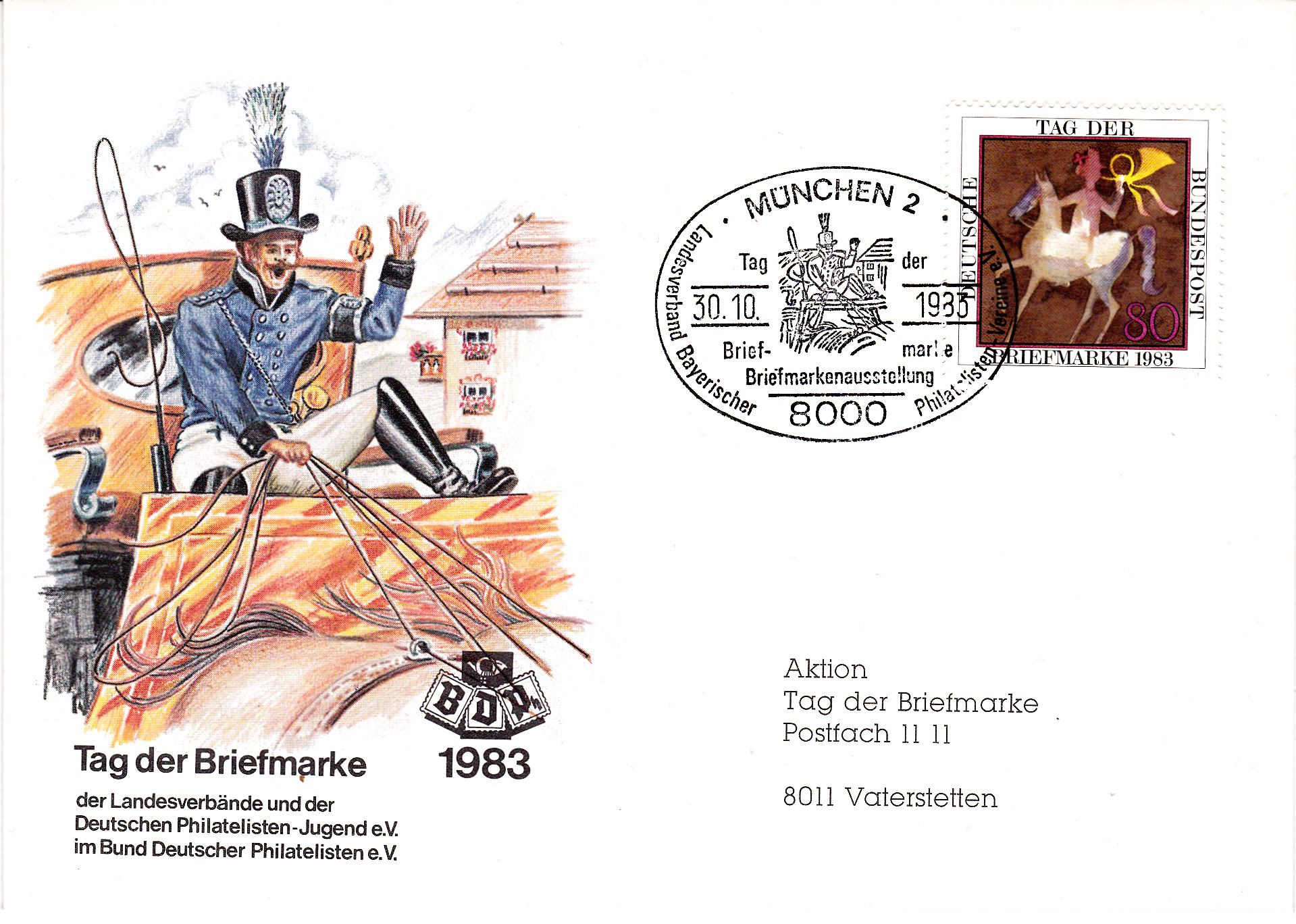 Sonderstempel aus München zum Tag der Briefmarke 1983 des Landesverbandes Bayerischer Philatelisten-Vereine e.V. vom 30.10.1983.