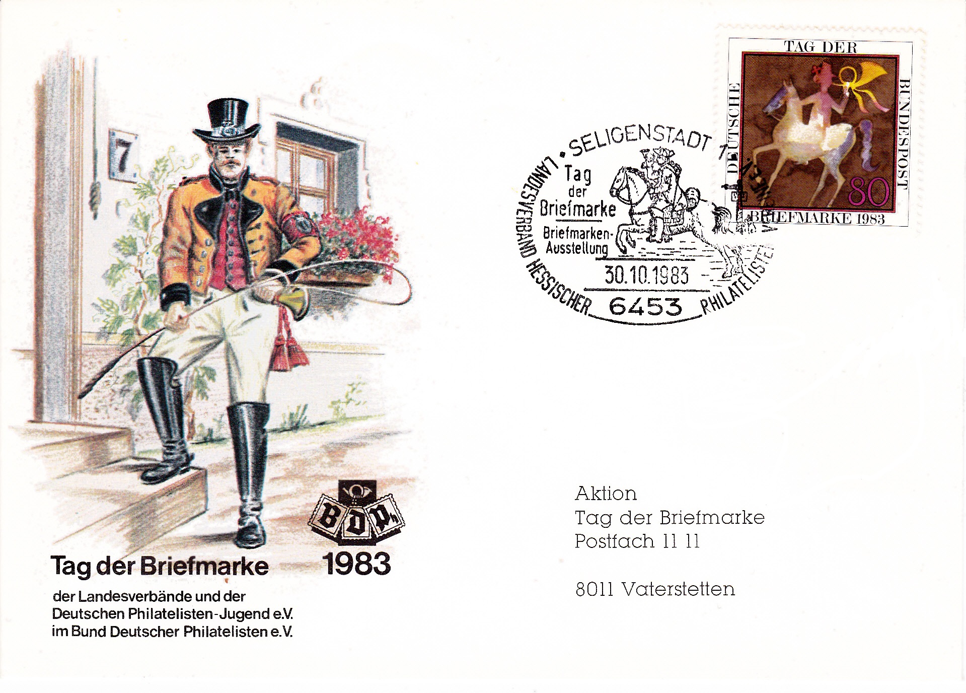 Sonderstempel aus Seligenstadt zum Tag der Briefmarke 1983 des Landesverbandes Hessischer Philatelisten Vereine e.V. vom 30.10.1983.