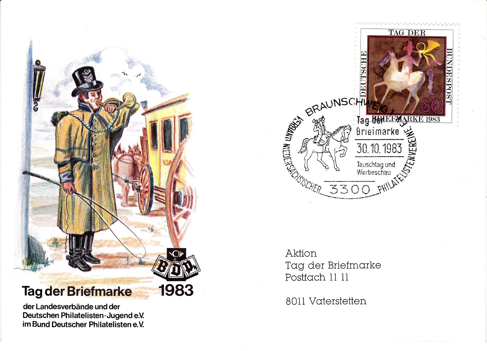 Diese Ganzsache zum Tag der Briefmarke in Braunschweig wurde auch mit dem Sonderstempel aus Braunschweig zum Tag der Briefmarke am 30.10.1983 abgestempelt.