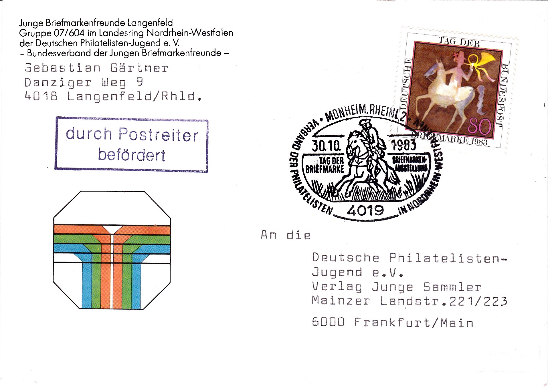 Hier noch mal ein Sonderstempel aus Monheim zum Tag der Briefmarke 1983 jetzt auf einem gelaufenem Brie mit einem Zusatzstempel "durch Postreiter befördert".