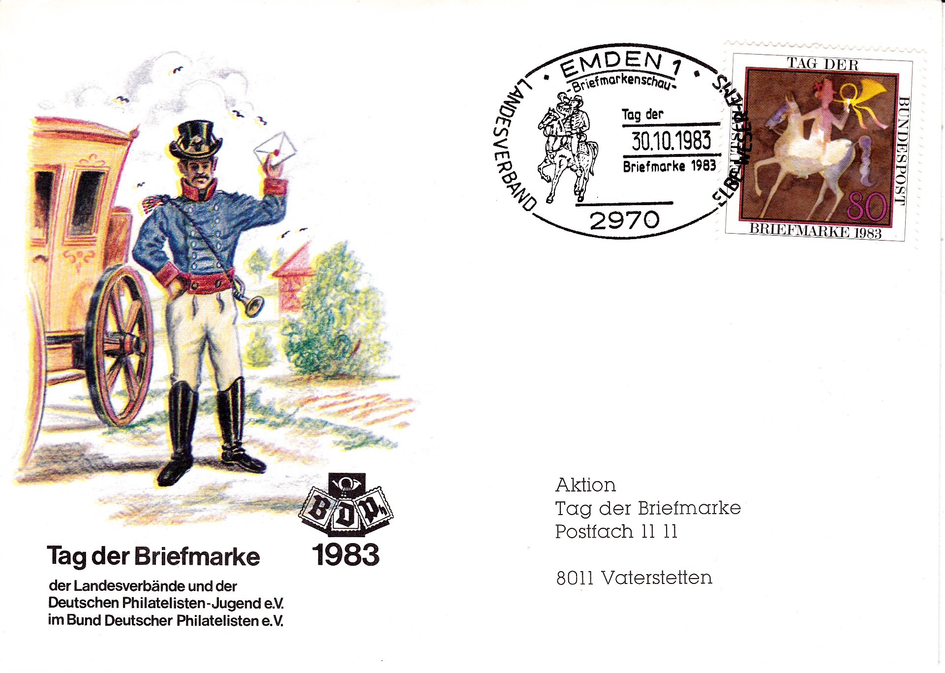 Sonderstempel aus Emden zum Tag der Briefmarke 1983 des Landesverbandes Elbe-Weser-Ems e.V. vom 30.10.1983.