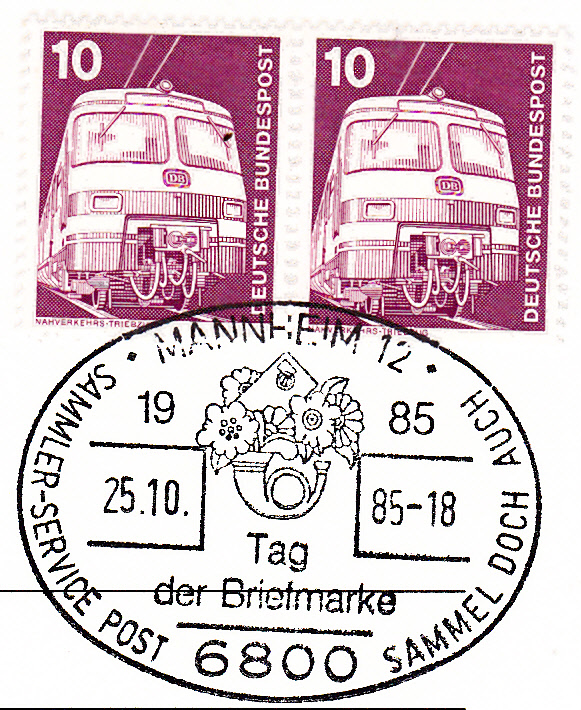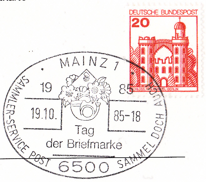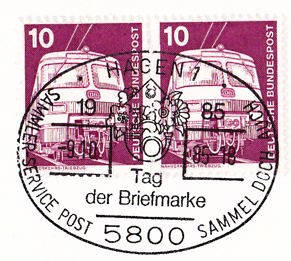 Der Sammler-Service der Post beteiligte sich an den Aktionen zum Tag der Briefmarke 1985 auch mit zahlreichen bildgleichen Sonderstempel. Hier der Stempel vom 5.10.1985 aus Bad Oldesloe.