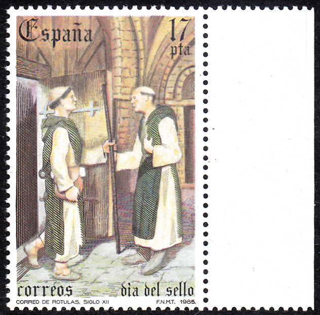 In Spanien erschien am 27.9.1985 eine Sondermarke zum Tag der Briefmarke 1985. Dargestellt wird die Mittelalterliche Mönchspost: Mönch überbringt Rotula (Rundbrief) an das Kloster Savigny/Frankreich (1122).