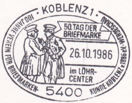 Sonderstempel vom 26.10.1986 aus Koblenz zum Tag der Briefmarke 1986 auf einer Postkarte nach Köin