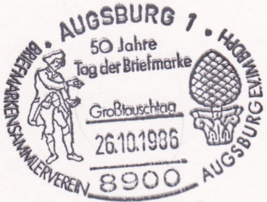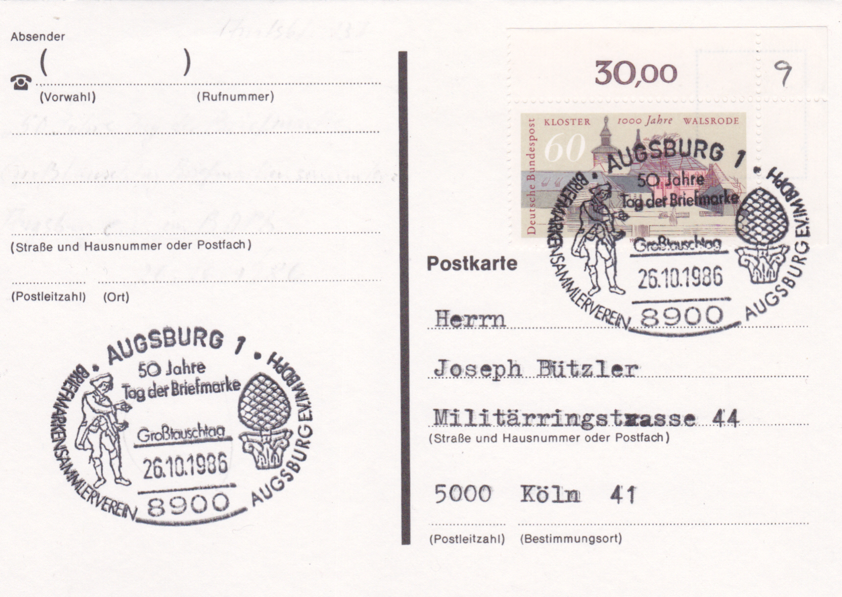 Sonderstempel vom 26.10.1986 aus Augsburg zum Tag der Briefmarke 1986 auf einer Postkarte nach Köin.
